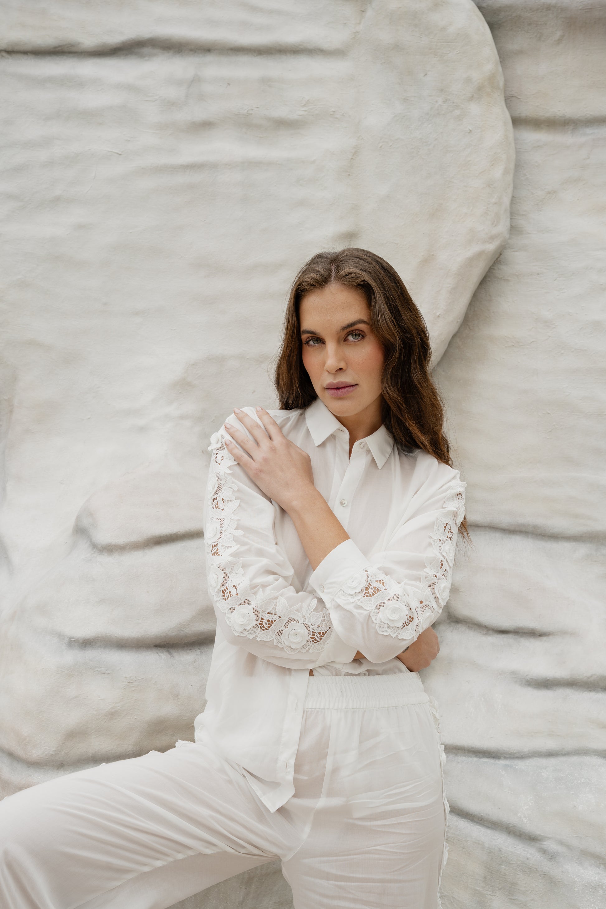 Una camisa blanca clásica con un toque poético: mangas largas adornadas
