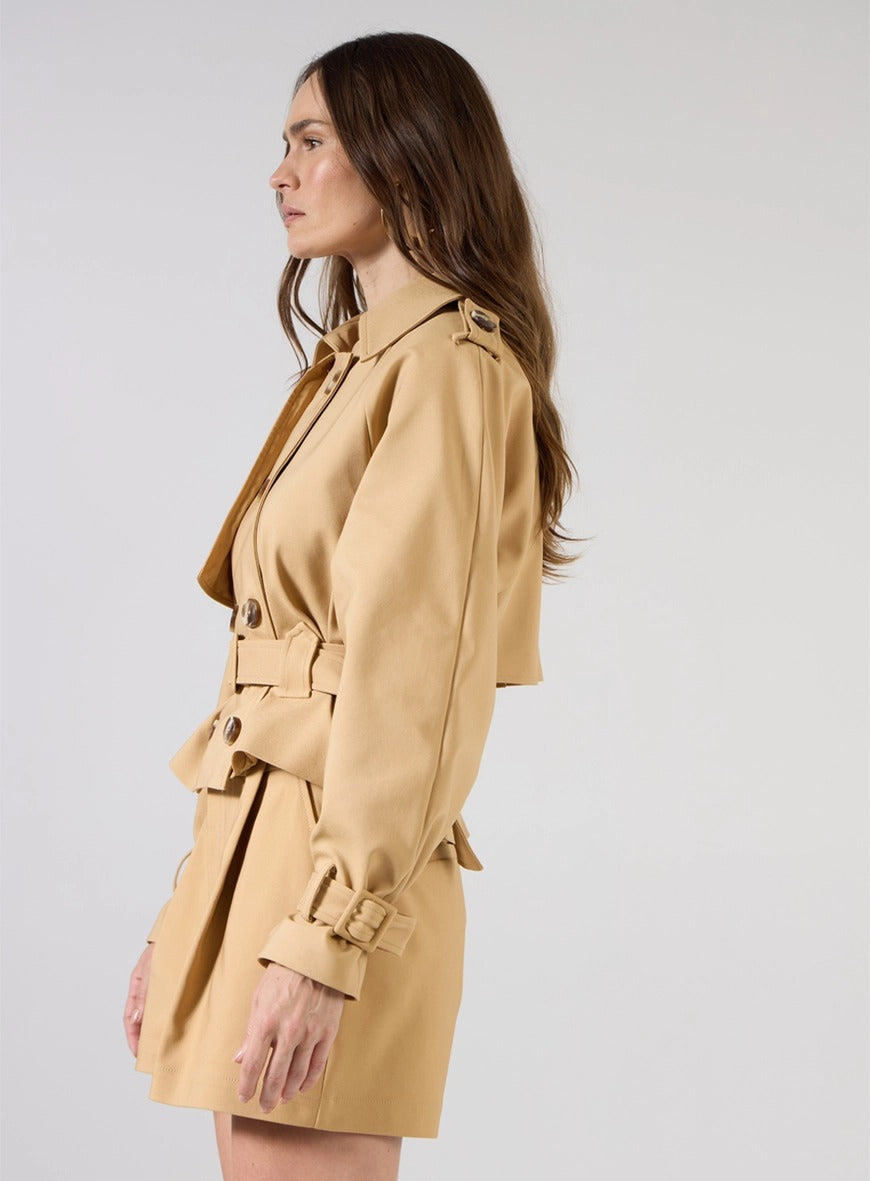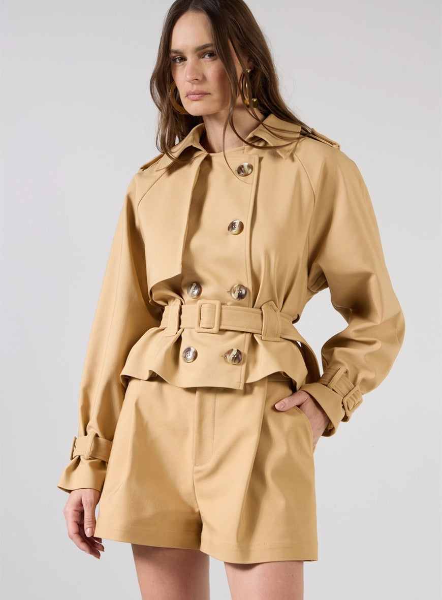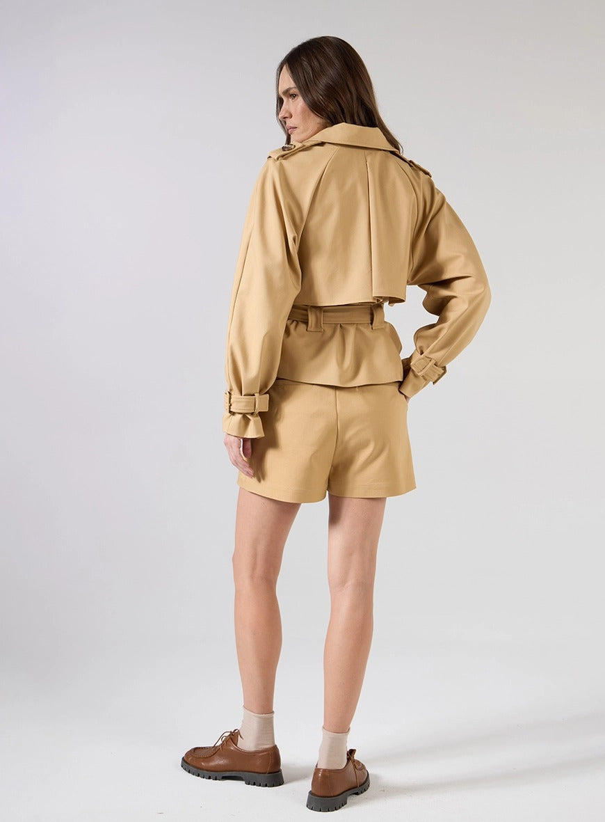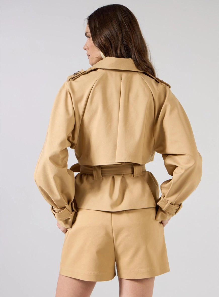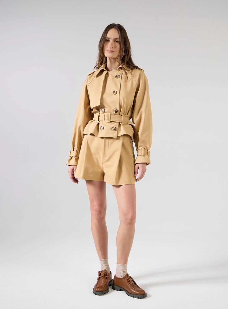 Ideal para producciones urbanas, citas diurnas, reuniones o entornos profesionales informales. Combina con sandalias de tacón bloqueado o zapatos para un look elegante, o apuesta por botas o mocasines para una propuesta más fashionista. Las prendas también funcionan por separado: la gabardina corta puede llevarse con vaqueros, vestidos o faldas, mientras que los pantalones cortos combinan perfectamente con camisas ligeras o blusas ajustadas.
