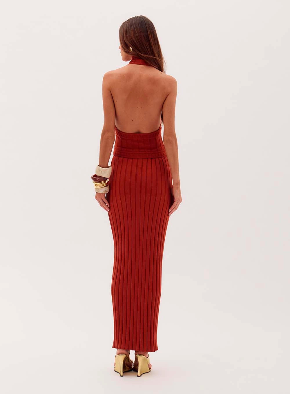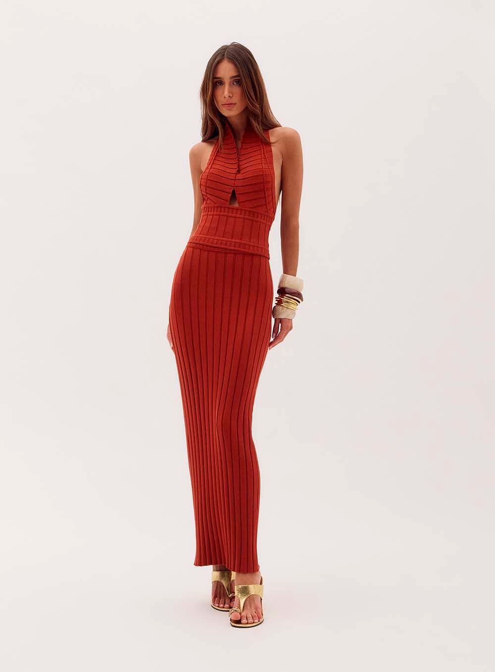 Diseño:Blusa de punto con estampados que crean un escote halter y un corte triangular en el busto. Falda larga de punto acanalado vertical que alarga la silueta.