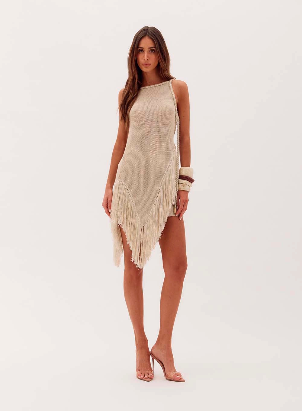 Diseño: Blusa de punto con corte fluido y puntas asimétricas, acentuada por largos flecos en el bajo. Pantalón corto de punto con textura sutil.