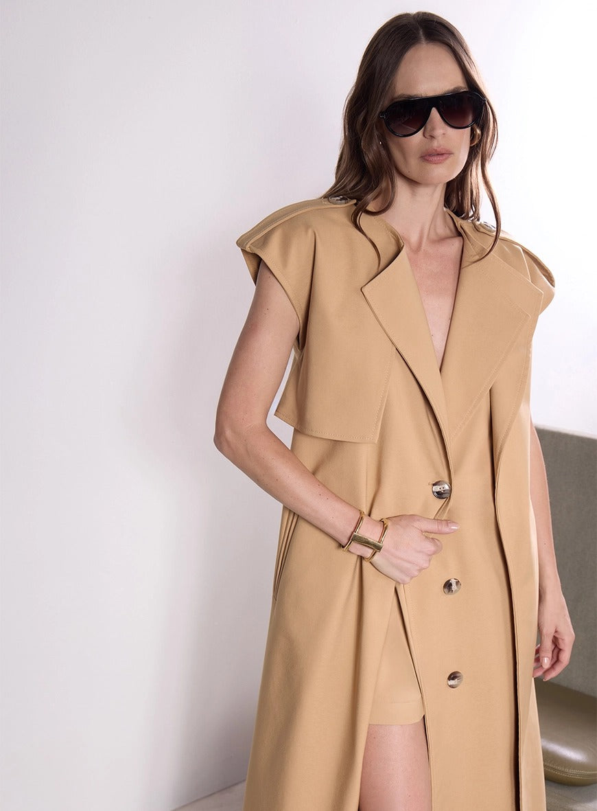 El vestido Midi Maxi Trench está hecho de una tela estructurada en un tono beige atemporal, inspirado en el icónico abrigo largo y que transmite elegancia y sofisticación en cada detalle. En la parte delantera, destacan el cuello ancho de solapa y la clásica superposición, complementados por el cierre con botones alineados y un cinturón de la misma tela con hebilla, que permite un ajuste preciso y realza la silueta.